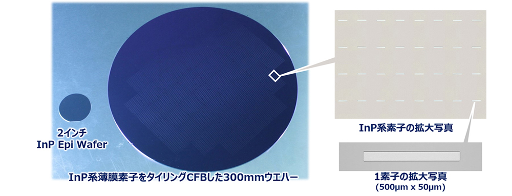 さらに、情報化社会の進展に伴いデータセンターの電力供給ひっ迫が懸念される中、化合物半導体などからなる光デバイスとSiデバイスを集積・融合する「光電融合」が強く求められている。特に、Si基板上に形成したシリコンフォトニクスへの光デバイスの集積は、今後の技術発展に向けて重要な要素となっている。しかし、SiとInPは物性、基板サイズ、製造インフラなど多くの点で大きな違いがあり、これらが社会実装への大きな障壁となっていた。OKIはこの課題解決のため、「タイリングCFB技術」を開発し、複数のInP系機能層を300mmSiウエハーなど大面積基板上に高精度・シームレスに接合する技術を確立した(参考文献5)。図5は300mmSiウエハーにタイリングCFBした写真である。これにより、光電融合に必要な大規模・多機能な光デバイスとシリコンフォトニクスの融合実現に向け、大きく前進している。