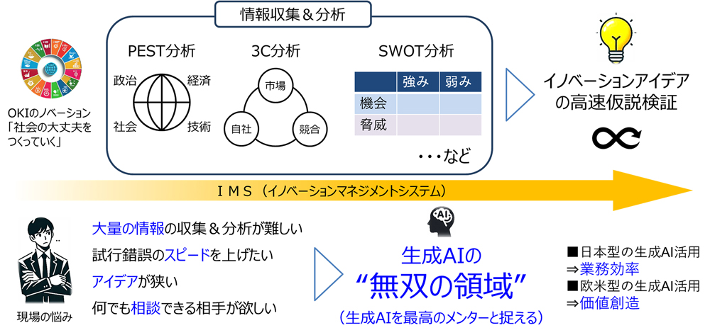 グローバル化の進展や技術革新、人口減少による人材不足といった複雑な社会課題を前に、企業や社会の持続的成長と新たな価値創出には、従来型の手法を超えた変革が求められている。OKIは、生成AIの高度な情報解析力と創造的アイデア生成能力に着目し、イノベーション推進の基盤技術として体系的な活用を推進してきた。さらに、IMS(Innovation Management System)の実践を通じ、質の高いアイデアの迅速な仮説検証と知識資産の有機的活用を目指し、アイデアや対話履歴を体系的に整理・活用できる生成AI活用イノベーション創出支援システム「ダ・ビンチ グラフ® (注1)」を開発した。本稿では、その概要と特長、IMS活動における貢献を論じる。