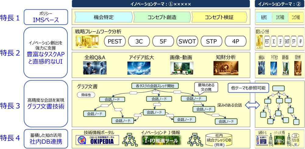 OKIは、イノベーションの質と量、さらには推進速度の飛躍的向上を目指し、IMS活動で「ダ・ビンチ グラフ」を開発した。本システムは、社員によるイノベーション創出の支援に加え、アイデアをグラフ文書(詳細後述)として体系的に蓄積・可視化することで、社内知的資産の共有と活用を促進している(図2)。