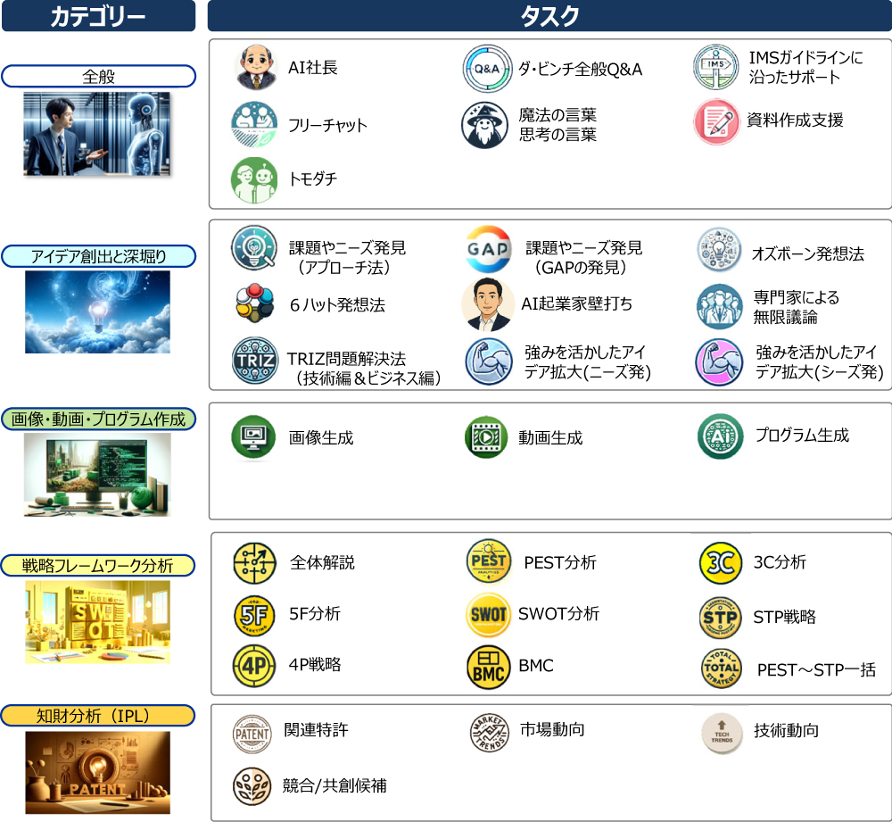 本システムは、多様な戦略分析用タスク群を包括的に提供し、PEST・3C・SWOT分析からSTP・4P戦略立案しBMC作成に至るまで一連のプロセスを豊富なタスクでアジャイルに遂行可能とする(図4)。フレームワークの活用方法や意義でもティーチング機能を備え、ビジネス戦略学習の場としても機能する。加えて、アイデア創出、画像生成、知財情報を基盤とした分析など、生成AIの得意タスクを最大限活用できる。さらに、直感的でビジュアルなUIと、会話数などをニューロンが成長するように可視化する機能が、ユーザーのモチベーション向上を促進する要素となっている。