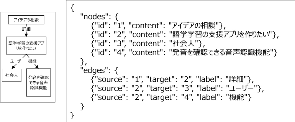 本システムの中心となる技術がグラフ文書技術である。グラフ文書とは、図5のように単語や文をノードとし、ノードとノードの意味関係をエッジで表現したネットワーク状の文書である。グラフ文書のデータは、ノードとエッジのリストで構成される。