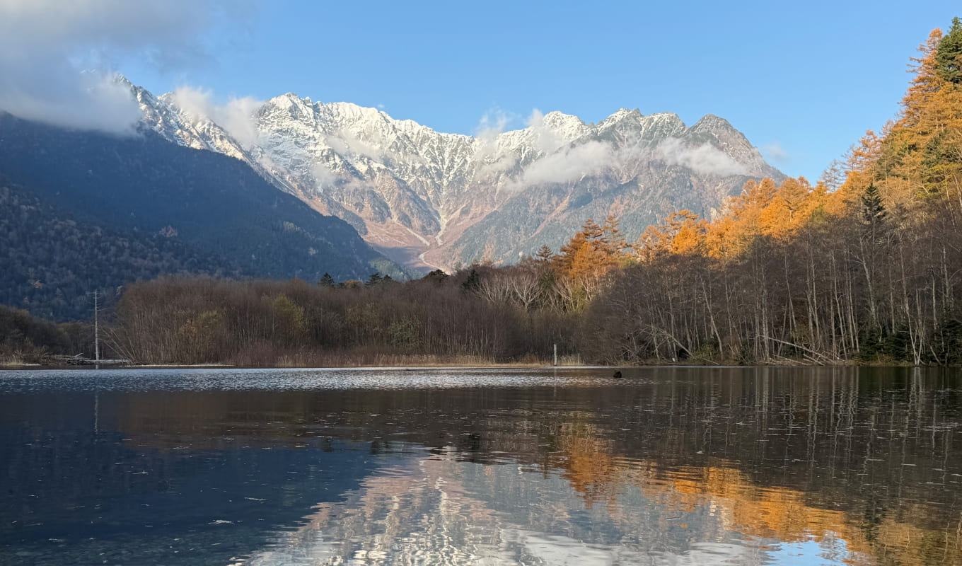 会社の同期や先輩と一緒に、長野県の上高地へ。大正池に映り込む穂高連峰の絶景は圧巻で、日常を忘れて見入ってしまいました。その後は白骨温泉まで足を延ばし、ゆっくりと温泉に浸かって豪華な食事を堪能するなど、最高の休日を満喫。気心の知れた仲間とのこういった時間が、また明日から仕事に向き合うための力になっています。