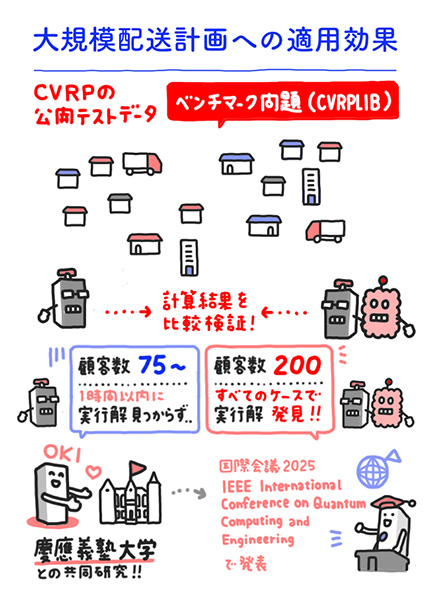OKIが開発した技術は、特に「容量制約付き配送計画問題(CVRP)」を対象としています。従来のソルバーでは、顧客数が100件を超えるレベルのケースでは1時間以内に解を見つけられていないため、この大規模な課題を克服するイジングマシンの力が注目されています。