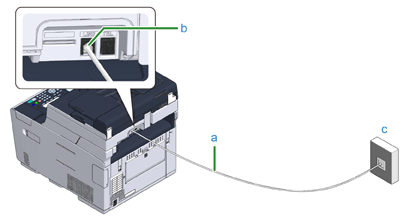 1. Enchufe el cable de teléfono incluido (a) que está conectado con la línea pública (c) (analógico) en el conector de la LÍNEA (b) de la máquina