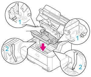 Ellenőrizze, hogy a henger jobb és bal pöckei (1) illeszkednek-e a készülék mindkét nyílásába (2), majd tegye vissza a hengert a készülékbe.