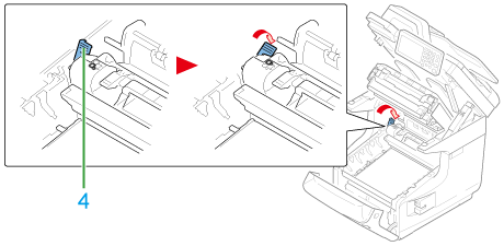 Zvedněte uvolňovací páčky (6) na fixační jednotce a opatrně vytáhněte zaseknutý papír směrem dopředu.