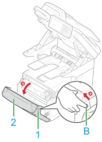 Vlote prst do prohloubeniny (B) na pravé straně přístroje a zataením za páčku otevírání čelního krytu (1) sklopte čelní kryt (2) směrem dopředu.