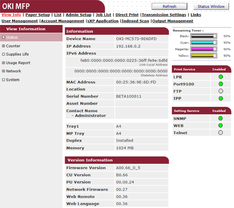 Makinenin o anki durumunu gösterir. Makinede gerçekleşen tüm uyarılar ve hatalar "Alarm bilgisi" olarak gösterilir. Ayrıca, her bir ağ servisinin işlem durumunu, cihazın bilgi listesini ve cihaza ayarlanmış IP adresini kontrol edebilirsiniz. |