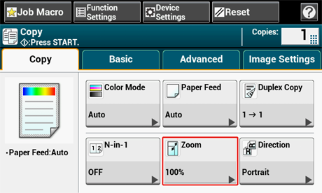 [Paper Feed(용지 급지)]가 [Auto(자동)]으로 설정되어 있을 경우, [Paper Feed(용지 급지)]가 자동으로 [Zoom(줌)]에서 [Auto(자동)]으로 변경됩니다. 설정이 변경되었다는 메시지가 터치 패널에 표시됩니다.