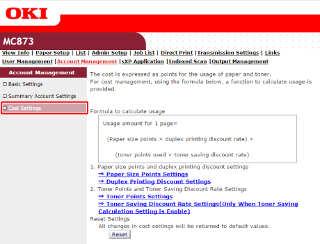 只有在點數計算類型是預設設定時,才可在機器的網頁上進行設定。如果 [Cost Settings (成本設定)] 未顯示,請檢查點數計算類型設定。