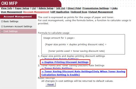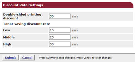 按一下 [Duplex Printing Discount Settings (雙面列印折扣設定)] 或 [Toner Saving Discount Rate Settings (Only When Toner Saving Calculation Setting is Enable) (節省碳粉折扣率設定 (僅於啟用省碳計算設定時))]。