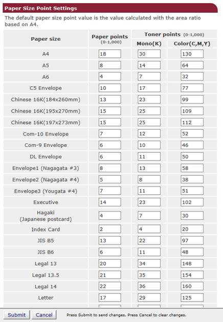 按一下 [Paper Size Points Settings (紙張尺寸點數設定)] 或 [Toner Points Settings (碳粉點數設定)]。