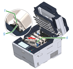 將新碳粉匣 (d) 左側的凹口 (f) 對齊感光鼓上的突出部分 (g),以插入新的碳粉匣,使碳粉匣和感光鼓的顏色標籤對齊,然後將右側輕輕插入至定位。