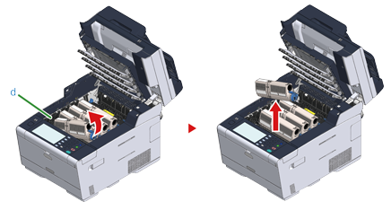 從右側抬起碳粉匣 (d),並從機器中取出。