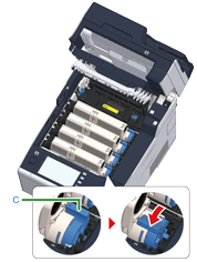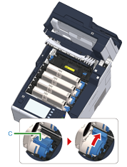 捏住碳粉匣的藍色鎖定桿 (c) 前端,並朝您拉動,直到前端對準碳粉匣的把手為止。