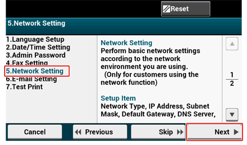 對於無線連線,您不需要在此處進行網路設定。按下 [Skip>> (略過>>)] 兩次並移至測試列印。[Easy Setup (簡單設定)] 完成後,將執行無線連線設定。