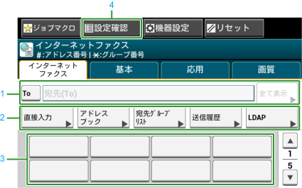 ファクスの送信先を選択します。選択された宛先が表示されます。 1つ以上の宛先が設定されているときは、[全て表示]を押して編集や削除ができます。 |
