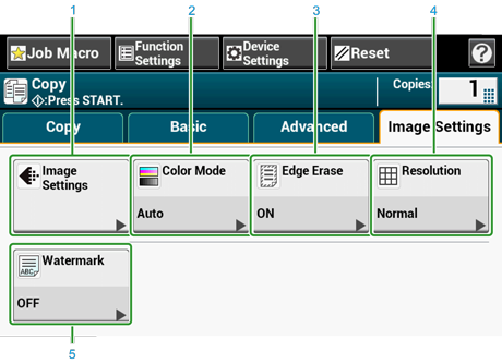 Hiermee geeft u de volgende beeldinstellingen op: Documenttype, Achtergrondverwijdering, Toon-Via Verwijdering, Dichtheid, Contrast, Tint, Verzadiging en RGB. |