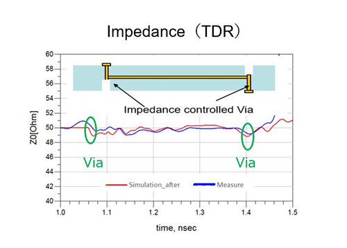 To address this issue, OTC has successfully developed High-Accuracy Simulation Technology for High-Frequency Vias, which accounts for the increasingly complex characteristics of high-frequency vias. Specifically, prior to PCB fabrication, the simulation results of the new technology are used to comprehensively evaluate and optimize the via structure, dimensions, and manufacturing margins, in accordance with our factories' manufacturing lines, to extract the optimal conditions meeting the signal quality requirements. OTC drew on its years of accumulated evaluation data to build its own database of parameters such as finished dimensions, manufacturing variations, and material properties. The technology enables highly accurate via modeling using 3D electromagnetic field analysis tools and ensures reliable signal characteristics in actual products.