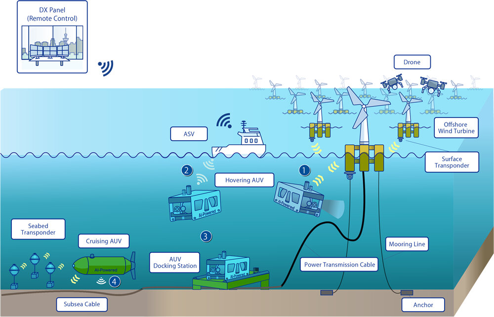 ① A Hovering AUV recognizes its underwater self-position with positioning support from surface transponder, performing inspection tasks on mooring lines, power transmission cables, and other underwater facilities.