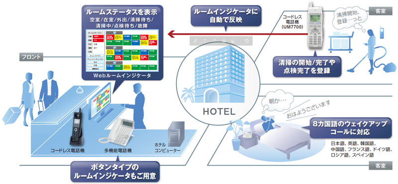 - PC(Webブラウザー)によるルームステータスの表示・変更や、コードレス電話機による客室清掃の状態変更をはじめ、ホテルコンピューターと連携した高度な顧客管理など、民宿・ペンション・介護施設からホテルまでの幅広いニーズに柔軟に対応できます。