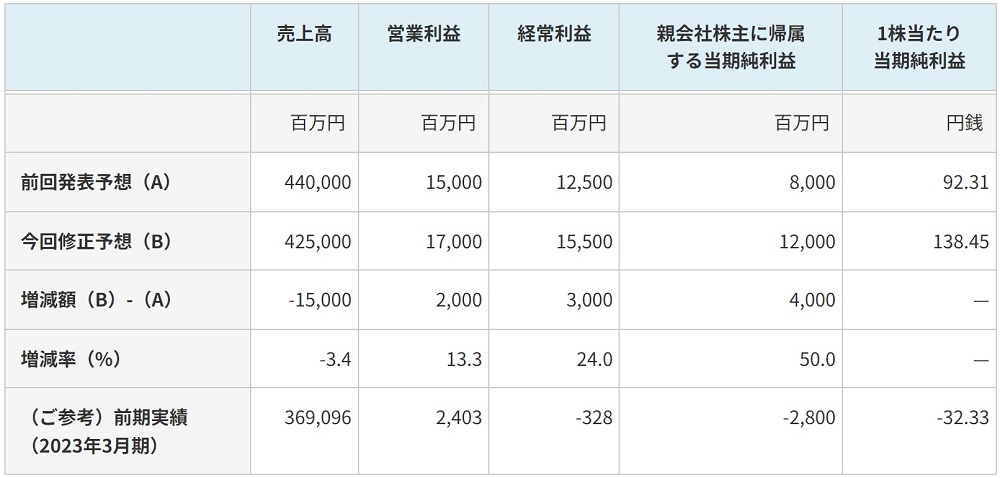 2024年3月期の業績見通しにつきまして、足元の事業環境と各事業の業績動向の他、資産適正化による投資有価証券売却益などを織り込み、2023年8月10日に公表した数値を上記の通り修正いたします。