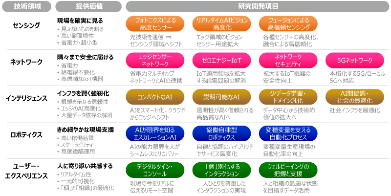 前述のとおりAIエッジは、AI、5G、IoT、ロボットなどのデジタル化の技術革新を取り込んだ広い概念である。これの強化に、OKIは五つの技術領域を定め、研究開発を推進している。クリティカルな現場を確実にみる「センシング領域」、都市部や山間部などを問わず隅々まで安全に情報を届ける「ネットワーク領域」、AIでインフラを賢く強靭化(きょうじんか)する「インテリジェンス領域」、エッジで人やモノに働きかけ、きめ細やかな現場支援を行う「ロボティクス領域」、そして人に寄り添い共感する「ユーザー・エクスペリエンス領域」である。