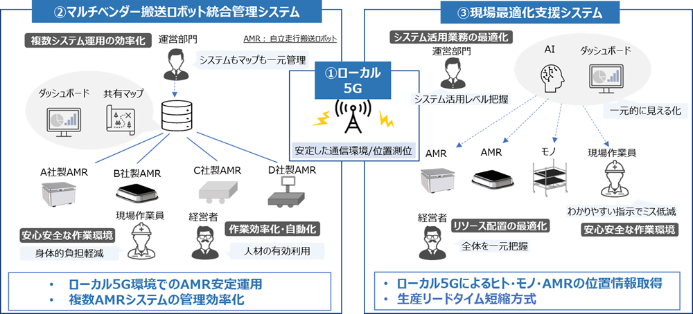 複数メーカーのAMR(注2)の工場業務に合わせた活用を統合管理の手間を掛けずに実現し、ローカル5Gによる位置測位データを活用しヒト・モノ・AMRの配置/作業工程最適化を実現することで、作業の効率化や人手不足解消をめざします。これらの実証を通して、地域における製造業の持続的成長に貢献していきます。