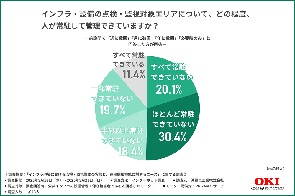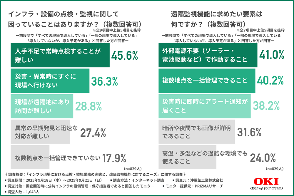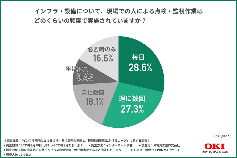 そこで今回、沖電気工業株式会社(https://www.oki.com/jp/)は、公共インフラの設備管理・保守担当者を対象に「インフラ現場における点検・監視業務の実態と、遠隔監視機能に対するニーズ」に関する調査を行いました。