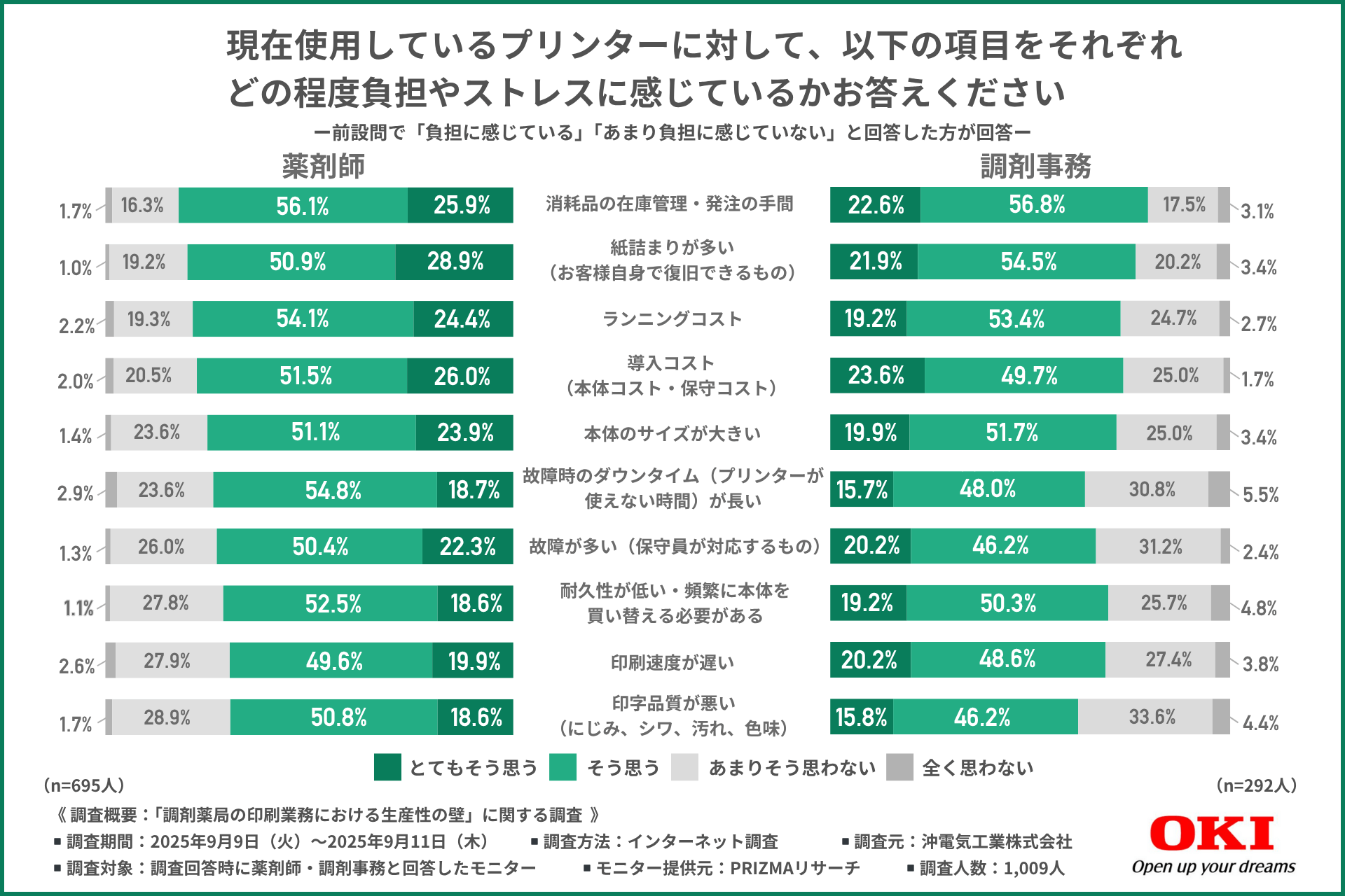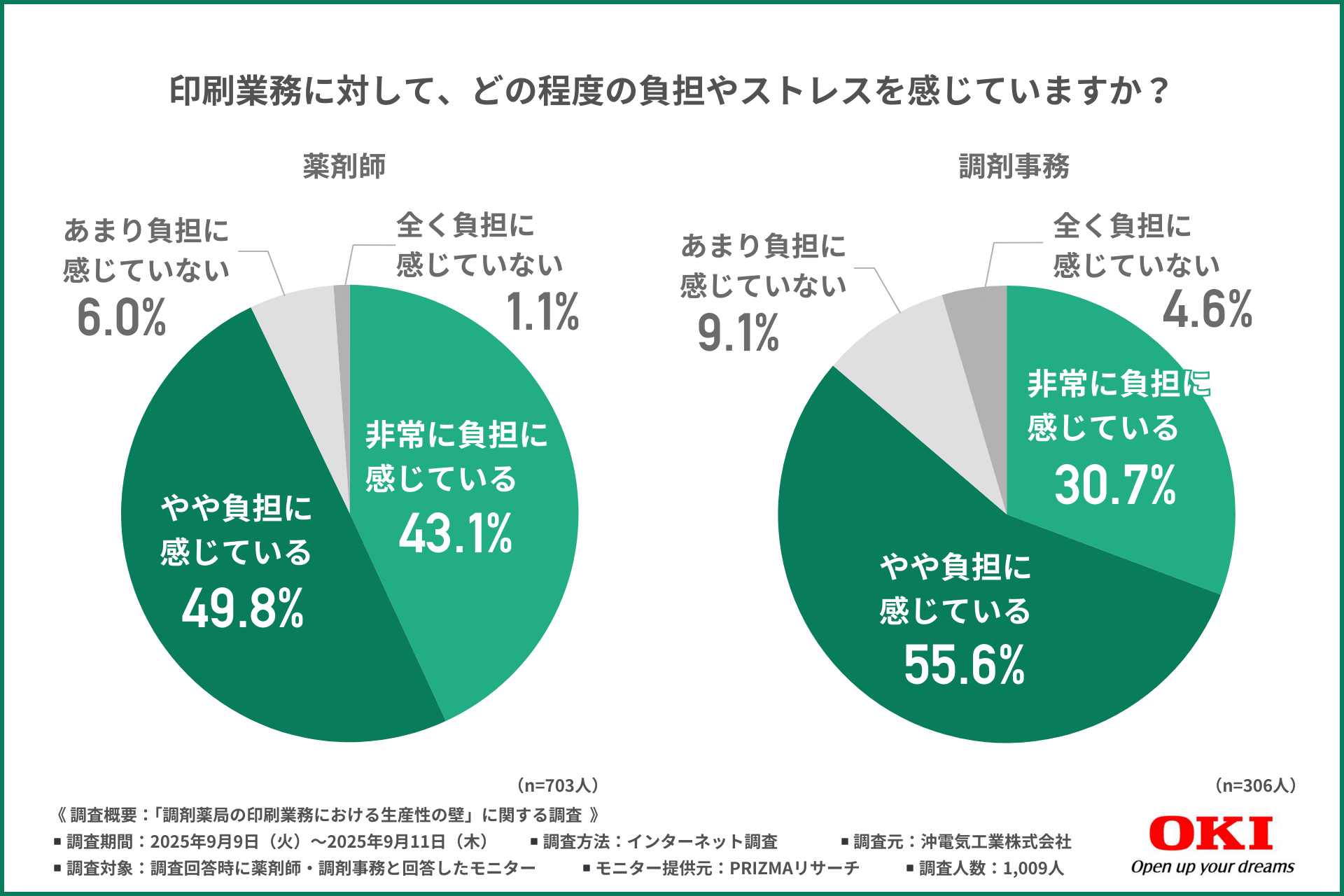 今回の調査で、調剤薬局における印刷業務は、薬剤師・調剤事務のいずれにおいても負担に感じている方が約9割にのぼり、大きなストレス源となっている実態が明らかになりました。