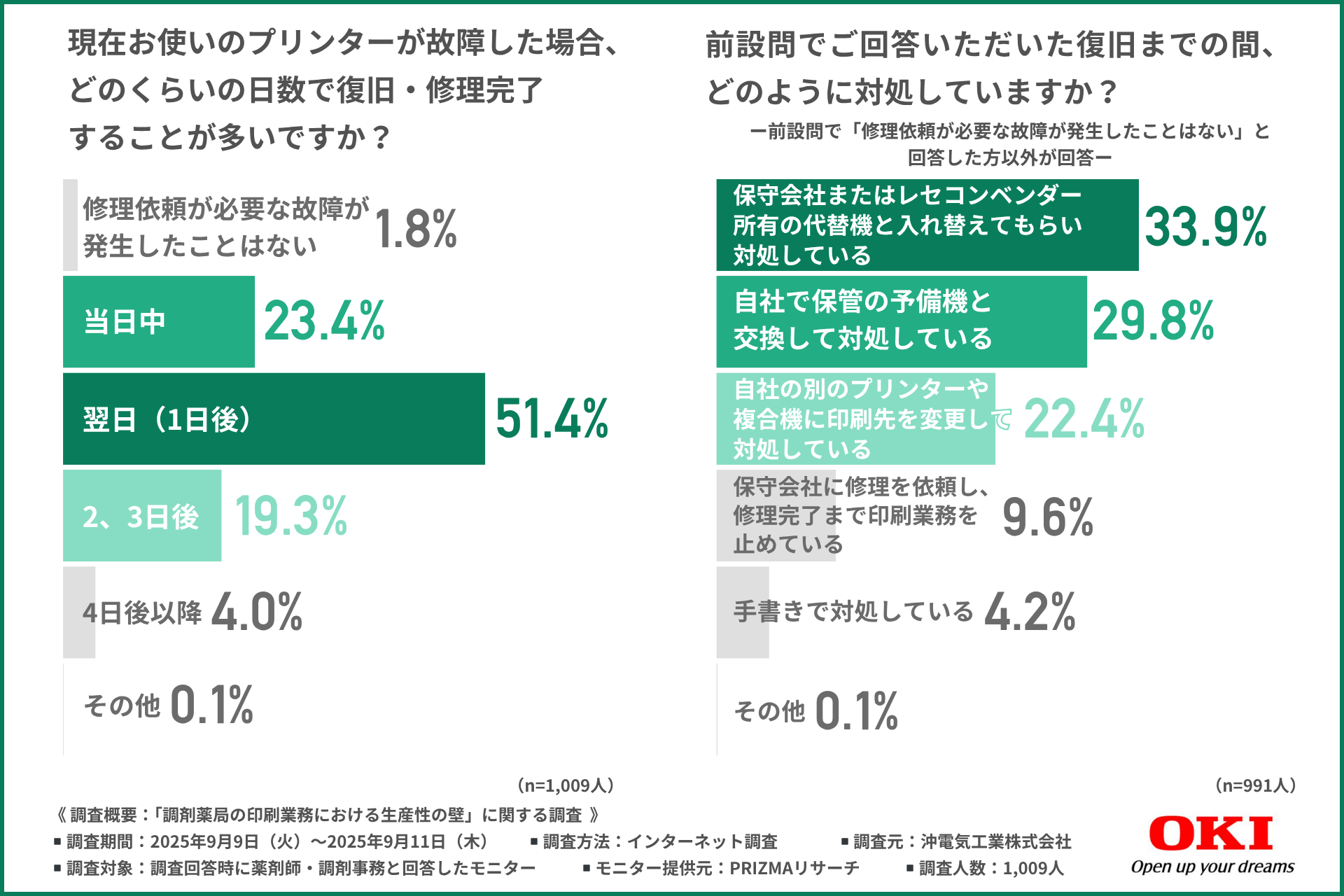 プリンターが故障した場合の復旧日数については、「当日中」や「翌日(1日後)」が約7割となり、多くの調剤薬局で一定の対応体制が確保されているようです。