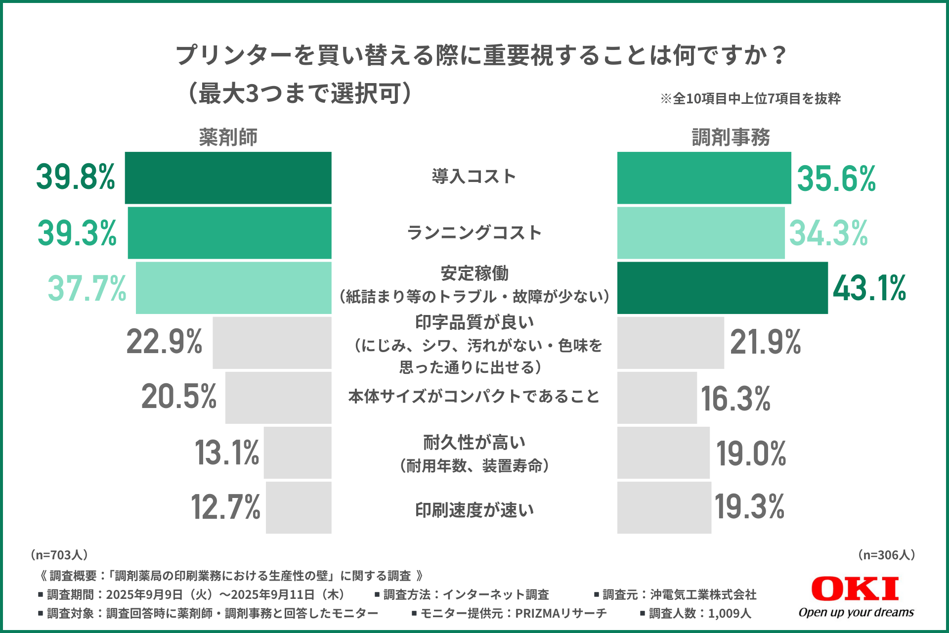 薬剤師、調剤事務ともに、「安定稼働」「コスト(導入・運用)」が買い替え時のポイントとして重要視されており、「速度」「印字品質」は若干後回しになる傾向があります。