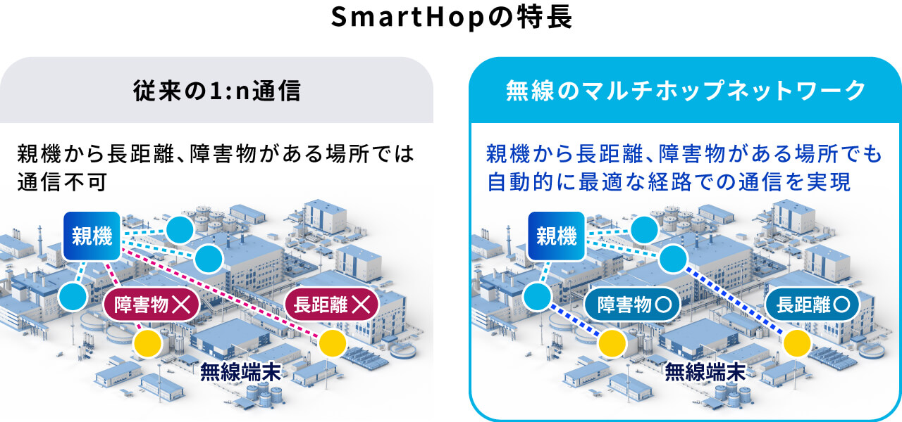 - マルチホップ技術により複数経路を構成可能、通信品質を向上