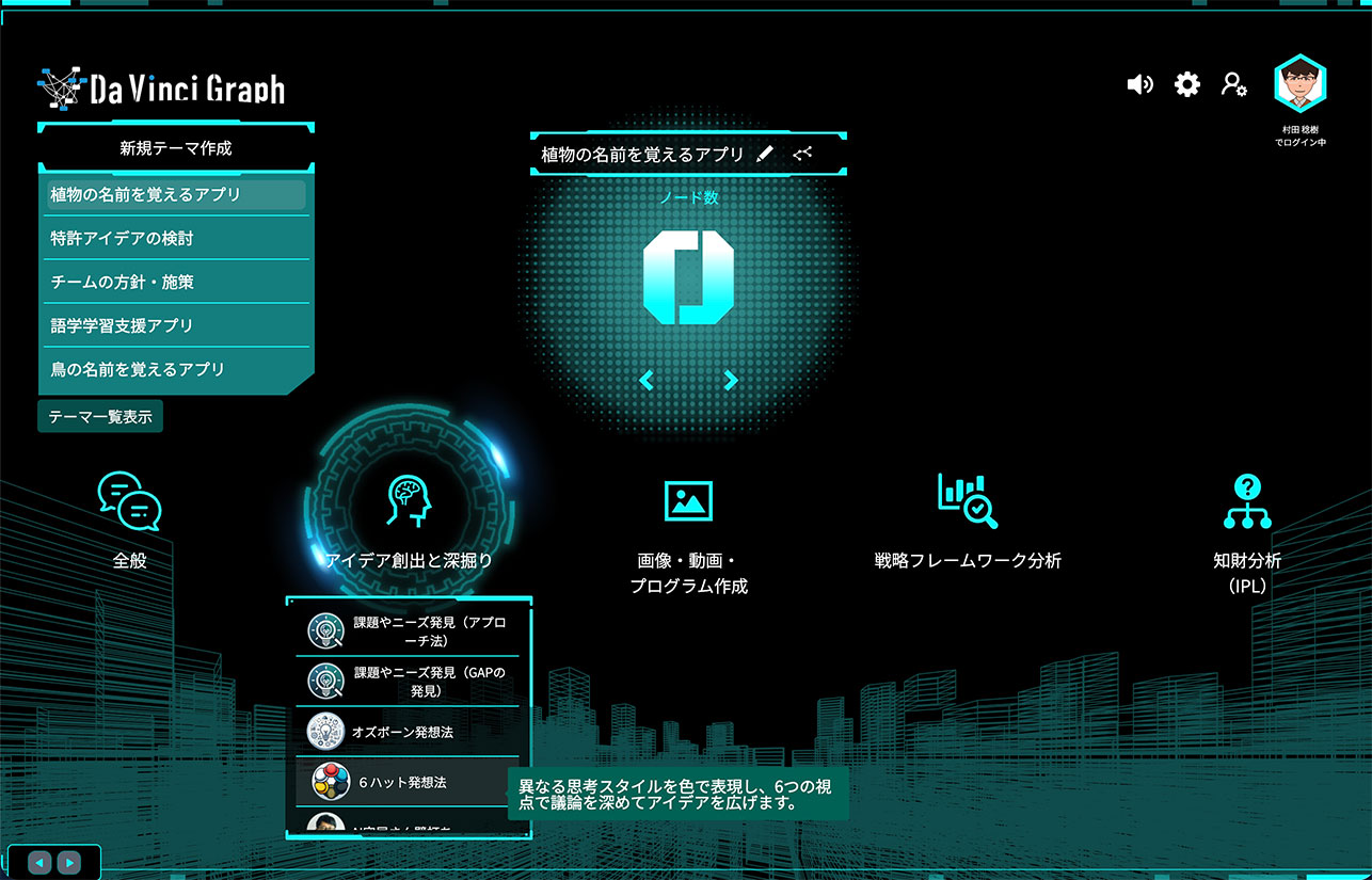 「ダ・ビンチ グラフ」は、まずアイデアのテーマ名を入力するところから始めます。課題や疑問、相談ごとでも構いません。テーマ名を入れると、カテゴリ別に整理されたさまざまなメニュー(「タスク」と呼びます)が表示されます。それらから選ぶことで、システムとの対話が始まります。