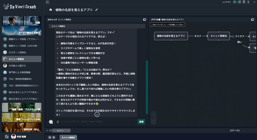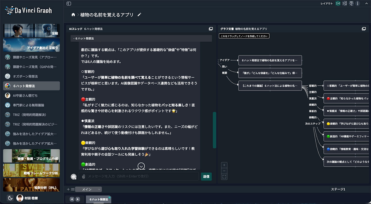 ここでは、上の画面のように、「植物の名前を覚えるアプリ」を思いついたということで、これをテーマ名にします。次に、このアイデアを広げてみたいので、「アイデア創出と深掘り」カテゴリにある「6ハット発想法」(6人の異なる視点でアイデアを出す方法)というタスクを選びます。すると、次の画面のように、真ん中にシステムとの対話画面が現れます。