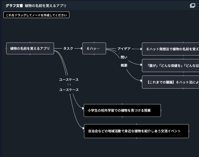 そして、画面の右に見えるのがグラフ文書。これが「ダ・ビンチ グラフ」の最大の特長です。このシステムとの対話内容を自動的に図式化して、見やすく構造化してくれています。このグラフ文書は自分で編集できるようにもなっていて、自分のアイデアをここに残すメモ帳(組織の知見や検討履歴も含む)としての役割を持っています。たとえば、先ほどの6人の意見で出たアイデアで不要なものを削除したり、内容を自分なりに書き換えたり、さらに新しいノード(四角の箱のこと)を追加して、自分のアイデアや思いつきを直接追加することができます。