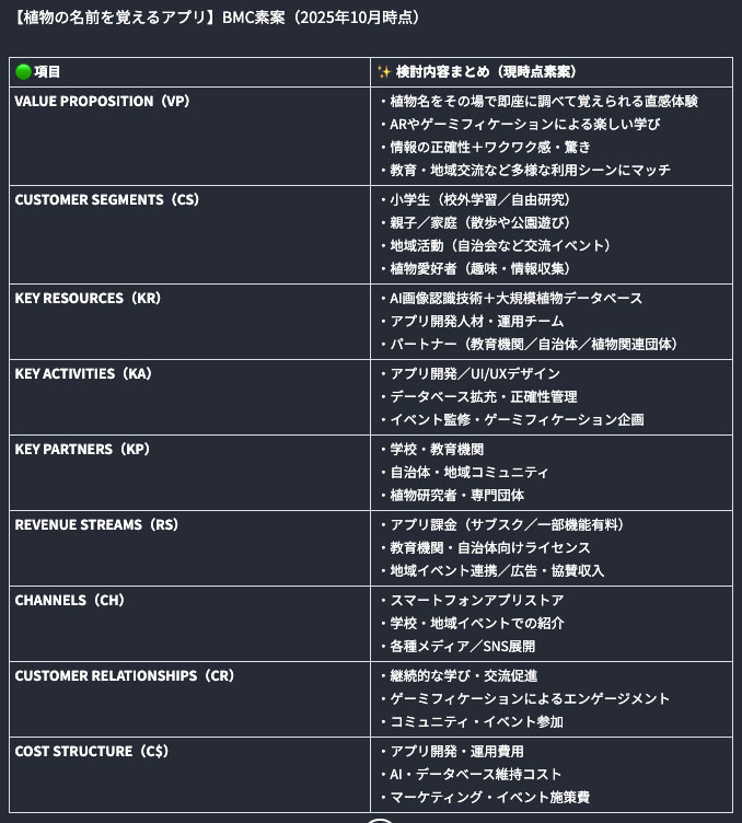 ここで注目すべきは、システムの連携力です。先ほどグラフ文書に追加した「小学生の校外学習での植物を見つける授業」「自治会などの地域活動」といったユースケース2つのアイデアが、自動でBMCの適切な項目に反映されているのが分かると思います。