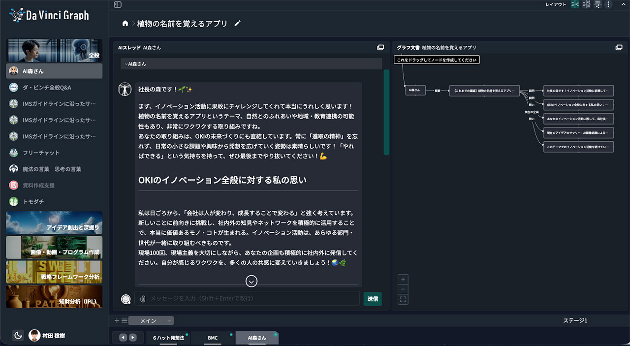 「ダ・ビンチ グラフ」のユニークな機能の一つが、「AI森さん」タスクです。これは、「全般」カテゴリに用意されており、当社の社長である森の視点や、OKIグループの経営哲学・進取の精神を反映したAIが、あなたのアイデアを経営層の視点から評価し、フィードバックを提供してくれるものです。