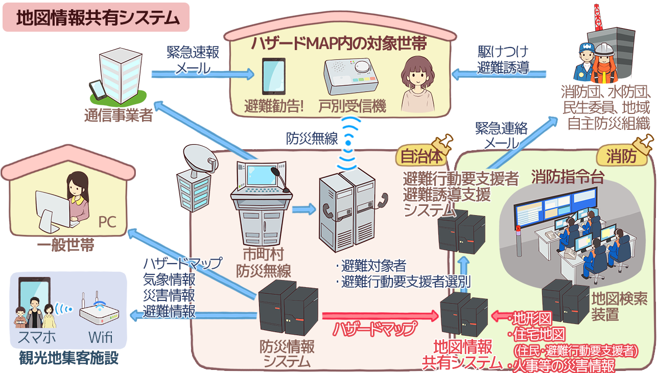 既設消防システムで保有する地図データ(地形図、住宅地図、住民などの属性情報)とハザードマップを共有、階層化することで、避難勧告エリアの情報をリアルタイムに利活用することができます。