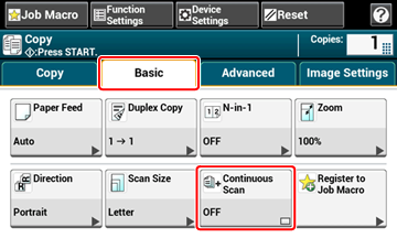 To scan multiple sets of documents and make copies as a single job, enable the Continuous Scan mode. This mode is useful when using the [Sort], [N-in-1], or [Duplex Copy] function.