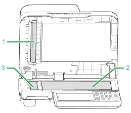 Wipe the ADF document holding pad (1), document glass (2), and ADF document glass (3) gently with a soft cloth that has been slightly moistened with water and squeezed well.