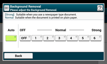 To adjust a level of the document background removal, you can select Auto, OFF, or adjustments in six levels.
