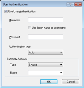 Set [User Name], [Password] of the user for user's authentication information and [Authentication Type], [Summary Account Name] for specifying user's authentication destination and authentication type.