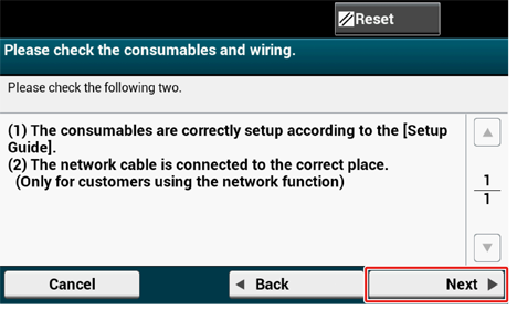 Check that the consumables and wiring are set up, and then press [Next].