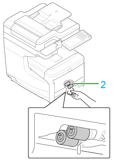 Wischen Sie die beiden Papiereinzugsrollen (2) im Gerät mit einem feuchten, gut ausgewrungenen Tuch ab.
