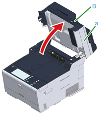 Halten Sie den Griff (B) und öffnen Sie die Scannereinheit (a) vollständig.
