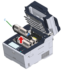 Nehmen Sie die Bildtrommel (c) aus dem Drucker und legen Sie sie auf eine flache Oberfläche.