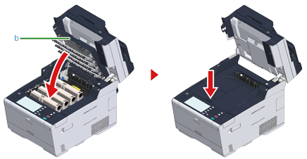 Schließen Sie das Ausgabefach (b) langsam und drücken Sie zur Bestätigung auf die Mitte des Ausgabefachs.