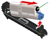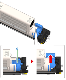 Halten Sie die Kartusche, drücken Sie die Spitze des blauen Hebels (d) der Tonerkartusche zusammen und drehen ihn vorwärts, bis die Spitze mit dem Zapfen der Kartusche zusammentrifft.