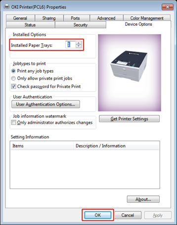 Se for utilizada a ligação de rede TCP/IP, clique [Get Printer Settings (Obter definições da impressora)] para definir automaticamente o número de tabuleiros.